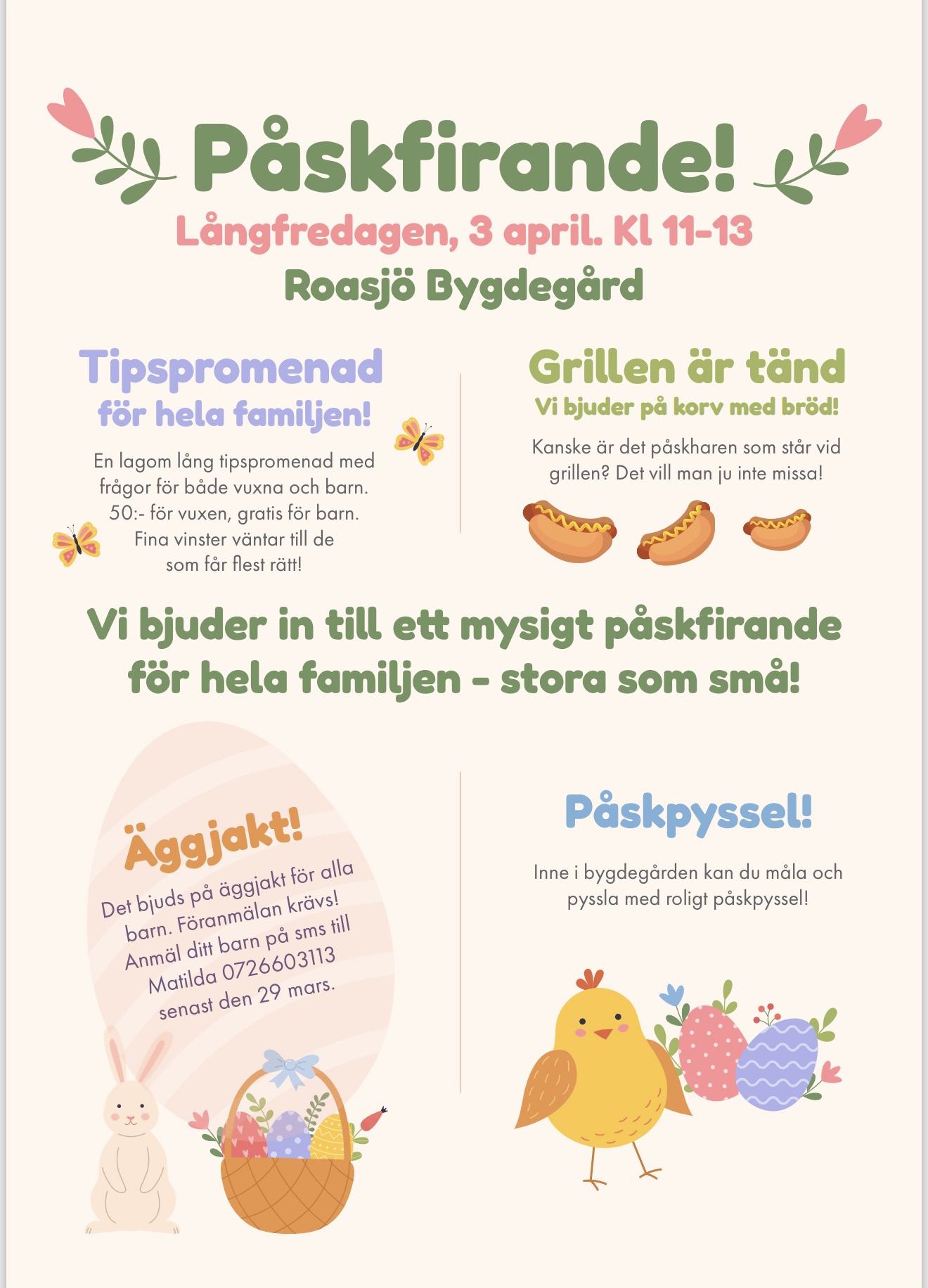 Anmäl barn till äggjakten via sms till Matilda på 072-660 31 13 senast 29 mars.
