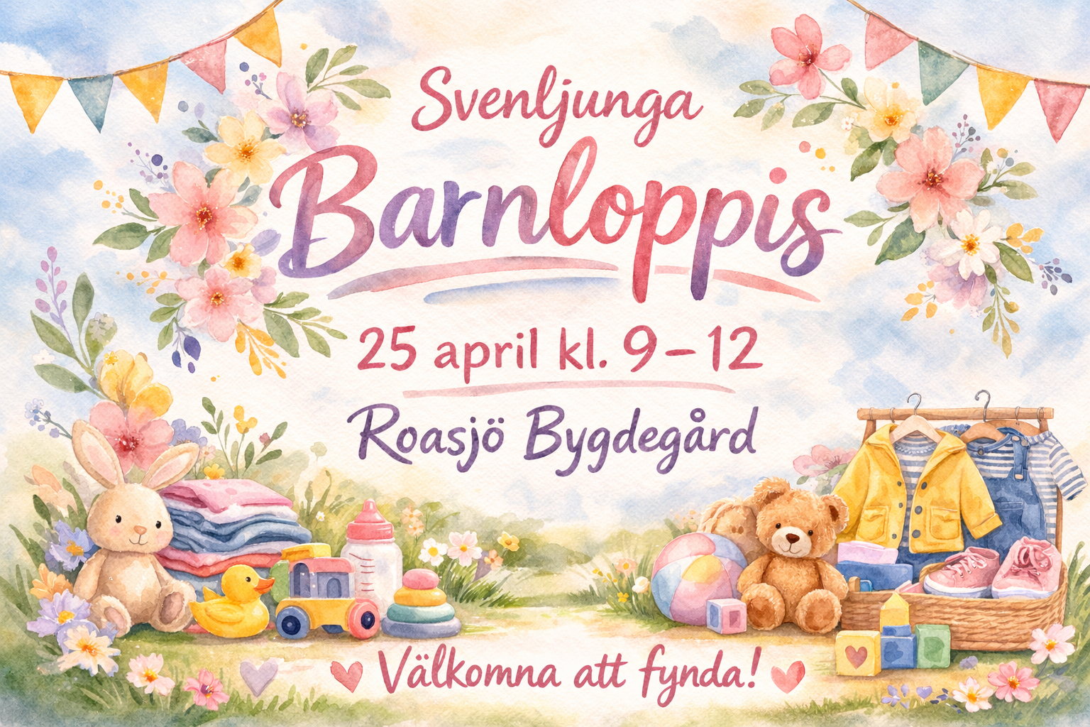 Den 25 april kl. 9–12 är det dags för Svenljunga Barnloppis i Roasjö Bygdegård. Under några härliga förmiddagstimmar kan du fynda barnkläder, skor, leksaker, böcker och babyprylar – allt samlat under ett och samma tak.